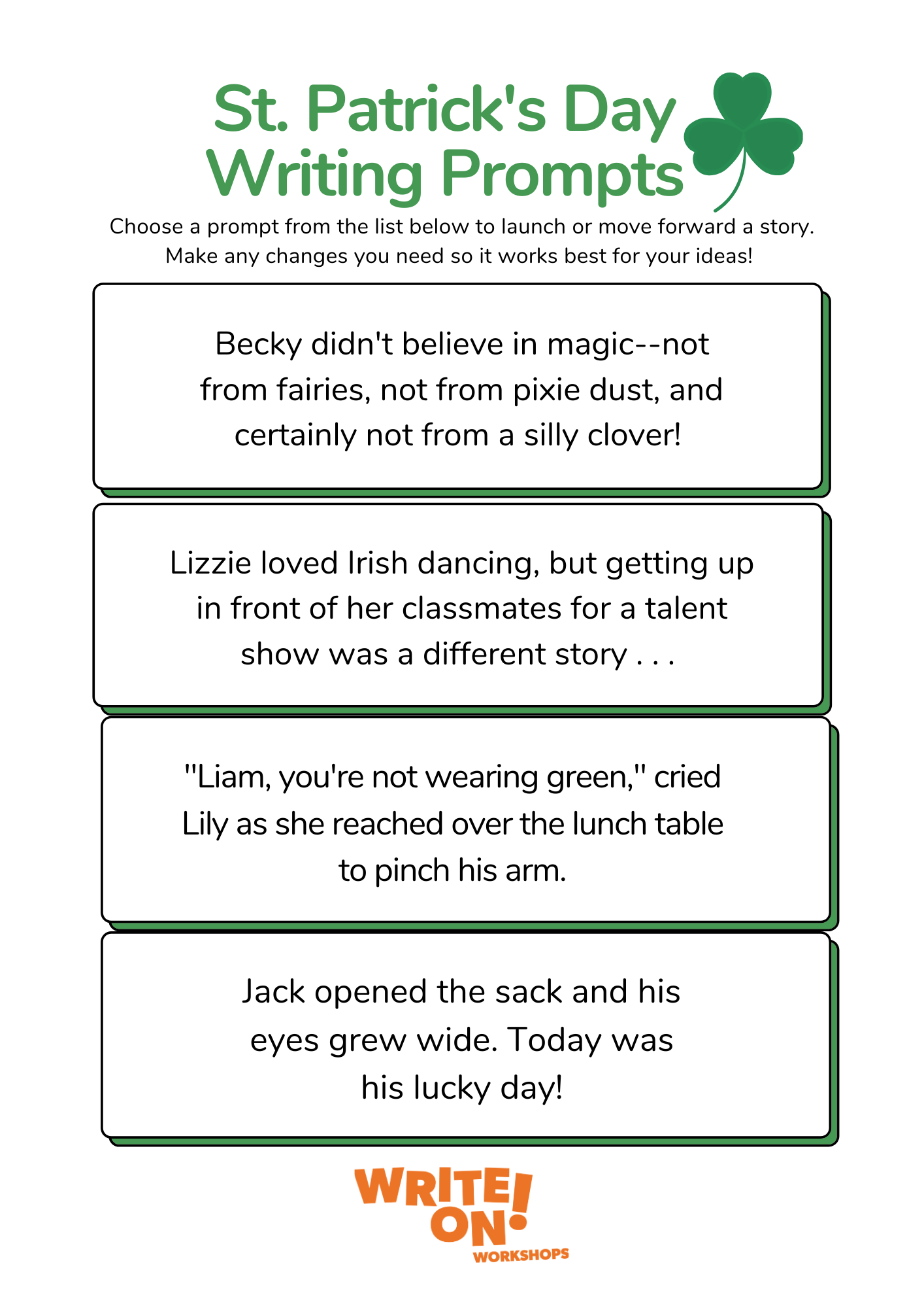 If you keep these simple writing prompt “rules,” your writer has a great chance at a good writing experience. One by one, these experiences build a writer! How lucky is that? Happy St. Patrick’s Day!